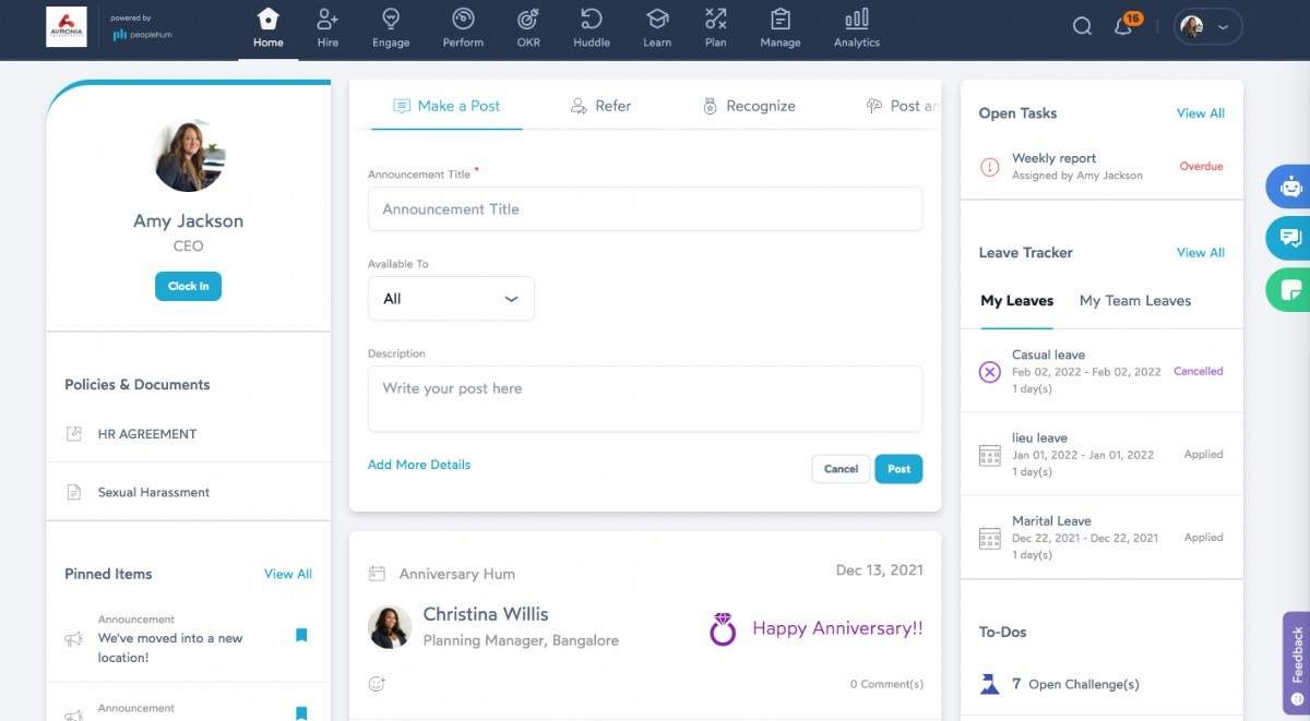 The other feature that we really liked was the suggestion feature because we want our employees to provide us with constant feedback, And peopleHum has a brilliant capability for the same where employees can provide feedback, the same can be allocated to the respective person in the organization. And not just that you can continue to be anonymous while providing a suggestion and not anonymous as well. So that's under the employees choose whether they want to be anonymous or not, which is a brilliant thing.