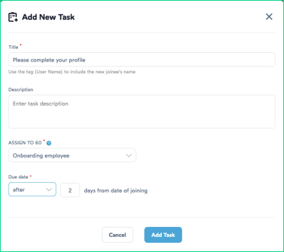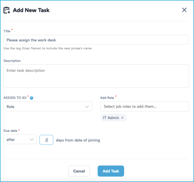 A task can be simply assigned to a role, hierarchy or even to the new employee who is joining the organization or the one leaving. This allows the admin to have flexibility over the task management, while ensuring the task is completed on time.