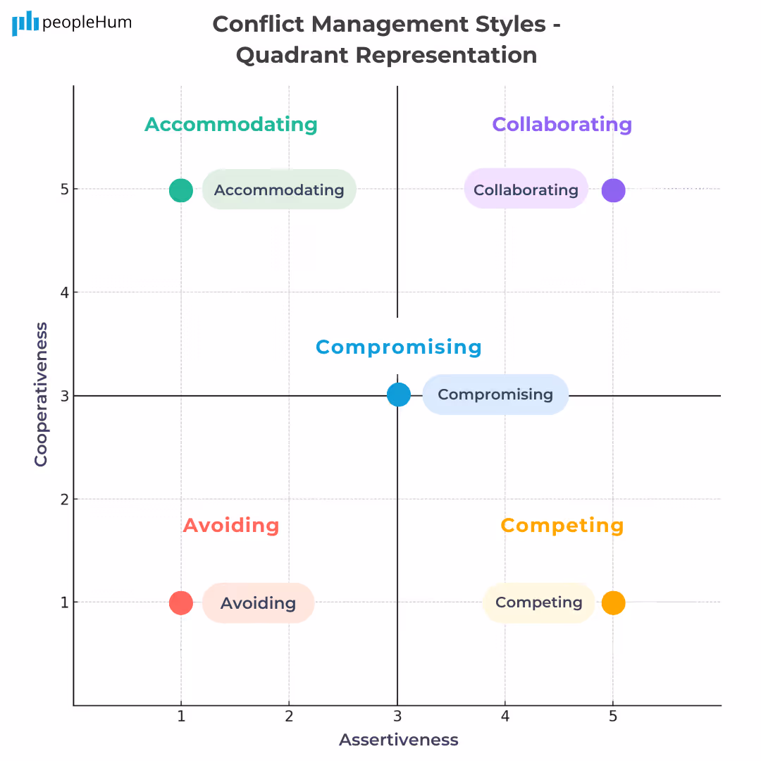 - Competing : High assertiveness, low cooperativeness; focuses on winning.